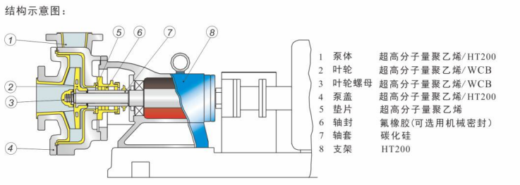 半開式葉輪、單級單吸懸臂式離心泵,過流部件全部采用超高分子量聚乙烯緊襯或制造,襯層不小于8mm。泵的承重部分為金屬材料,既可配置氟橡膠負(fù)壓密封圈,外加水冷卻裝置,也可配置機(jī)械密封。